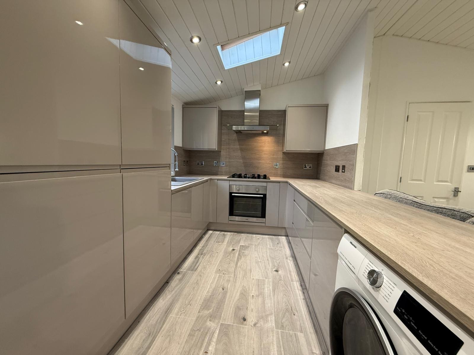 Kitchen recently upgraded to a more moderne style, integrated dishwasher & free standing washe/dryer, over, hob, extractor & fridge/freezer