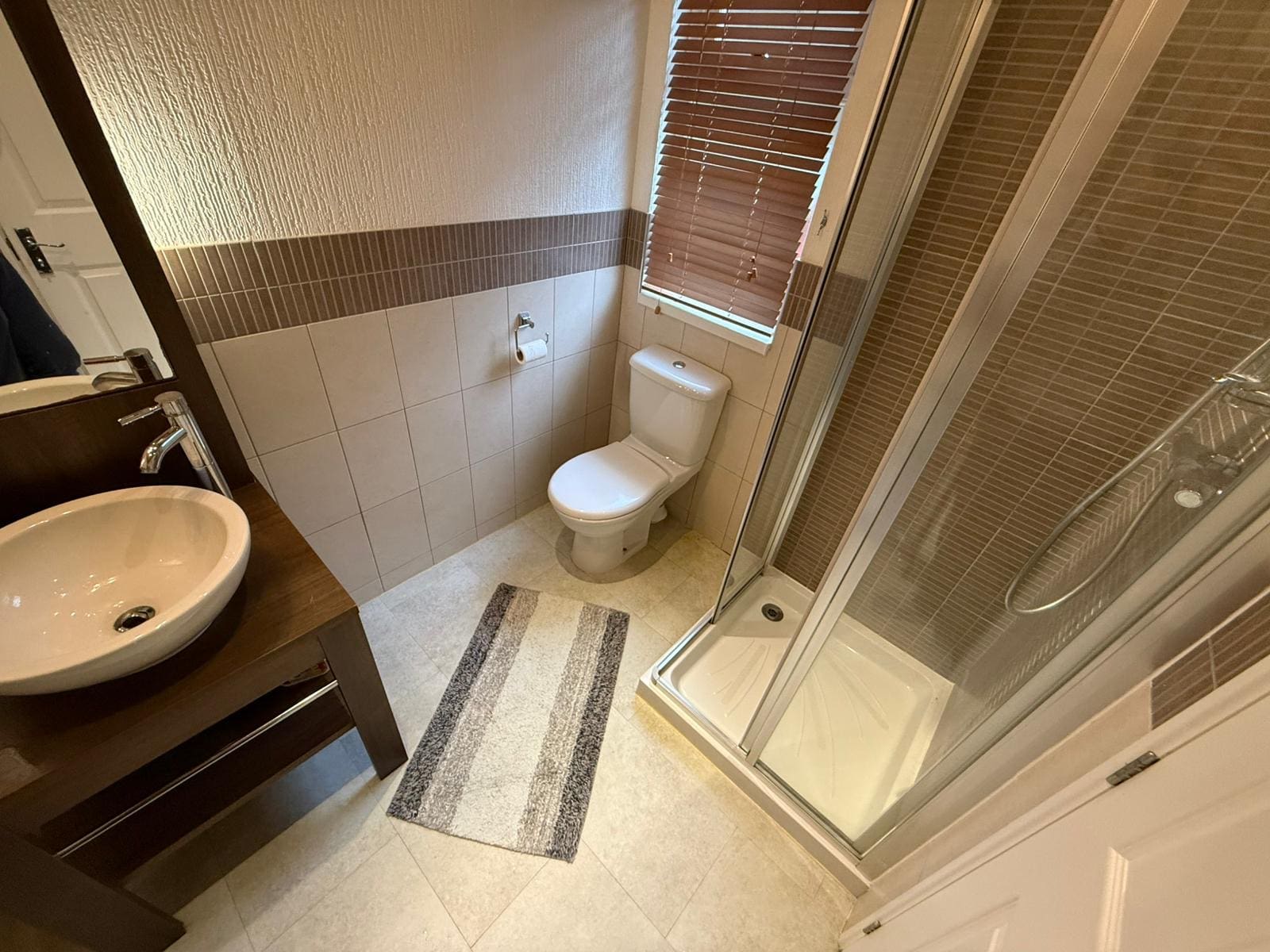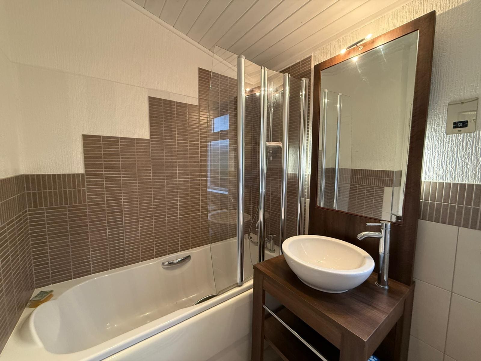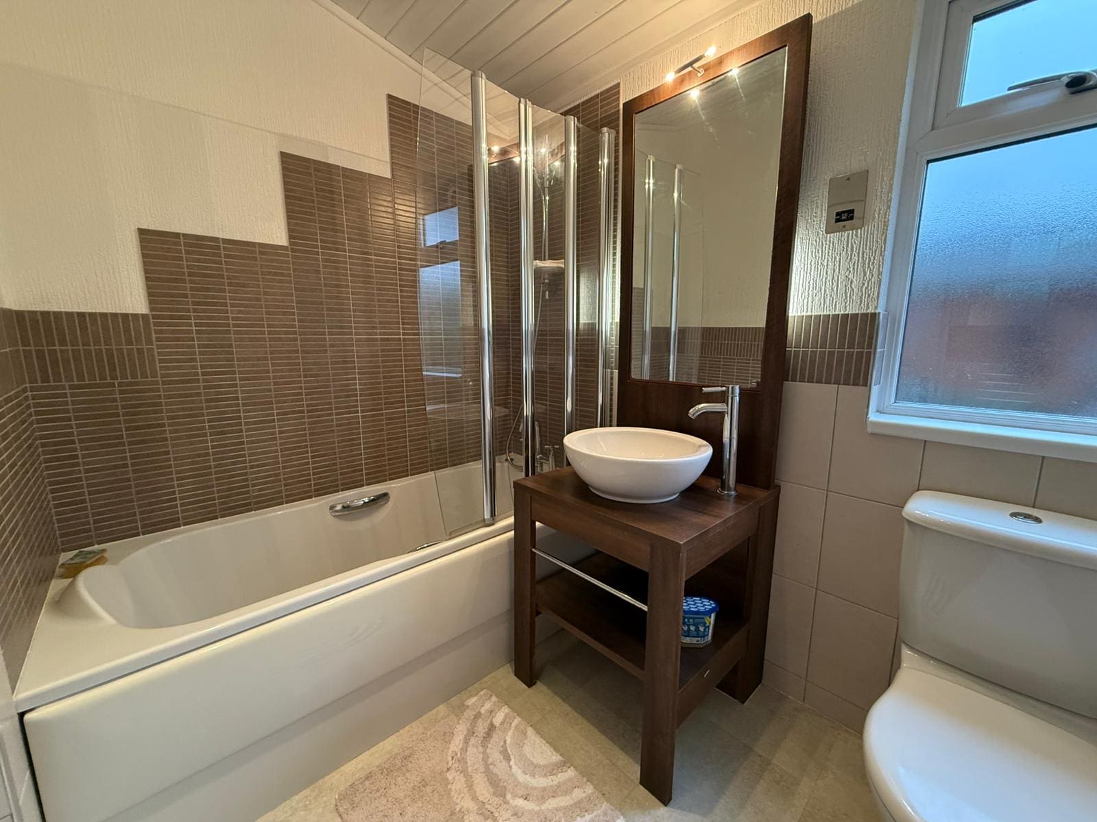 Main bathroom with full sized bath & shower above, tiled walls & feature sink unit